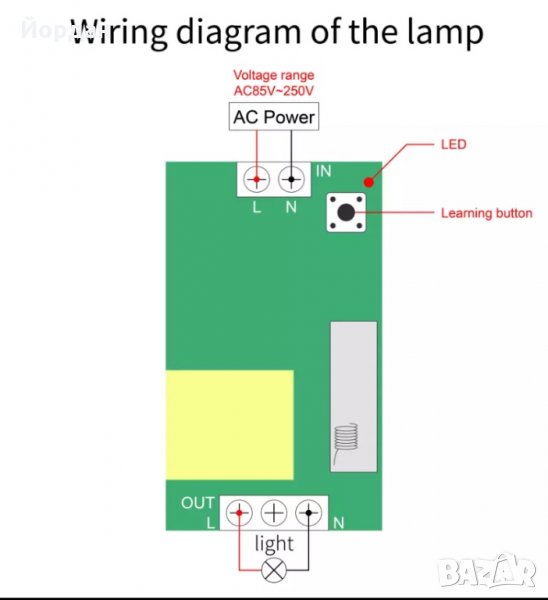 В платката се пуска напрежение от 220v на вход, а на изход се свързва даден консуматор. След това посредством бутон се настройва да работи с избрано он Вас дистанционно.