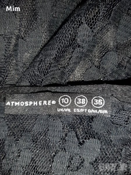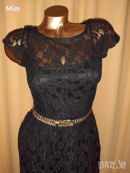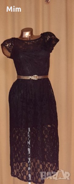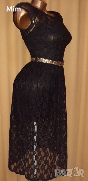 Черна дантелена рокля с късо ръкавче с плетен кожен колан с гайки в талията може да се маха ,с къса подплата с презрамки под мишниници 40 48 см едностранно, талия 34 см едностранно, ханш 70 см едностранно дължина 105 см закопчаването е странично с цип и отзад на врата с копченче.