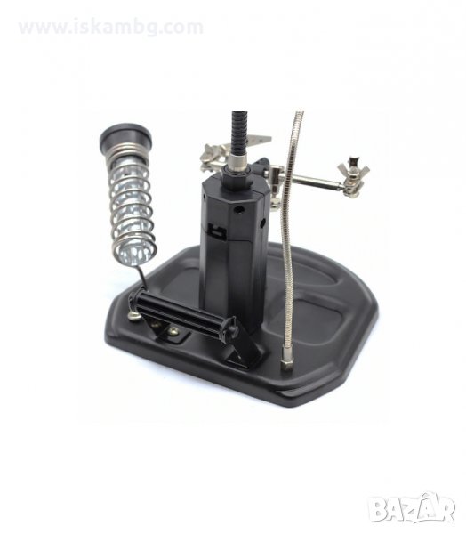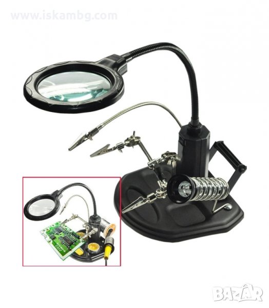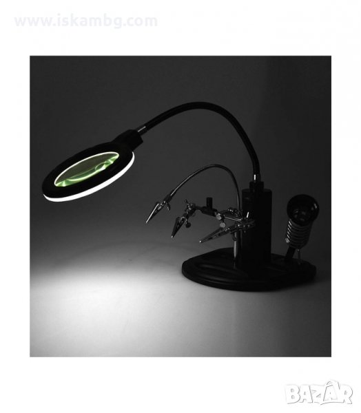 Тя ни позволява да фиксираме частта неподвижно с помощта на скобите(крокодил), а висококачествените лещи осигуряват перфектно увеличение на обекта без значение размерите му. Включени са две допълнителни мини-лещи, които са инсталират под основната и имат диаметър 35 mm и увеличението им е 2х или 5х. Третата ръка има led подсветка, която свети ярко (5 светодиода) и се захранва както от батерии, така и от 220V.