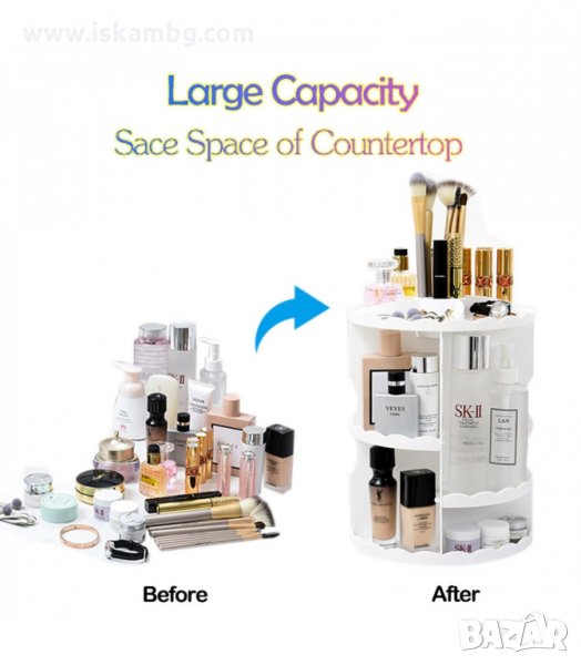 Въртящия се на 360 градуса органайзер е чудесно допълнение към Вашата домашна гримьорна като едновременно прилежно подрежда използваните от Вас продукти и спестява място.
