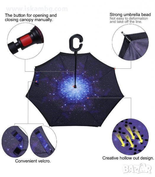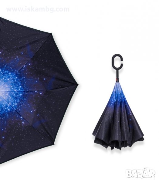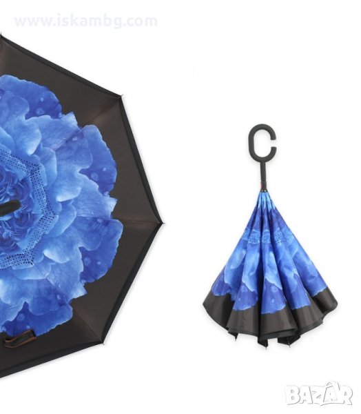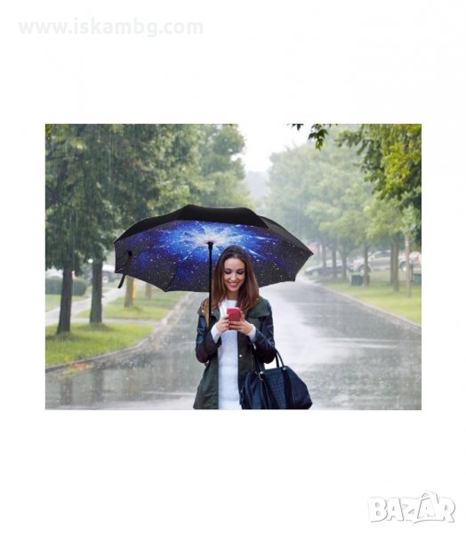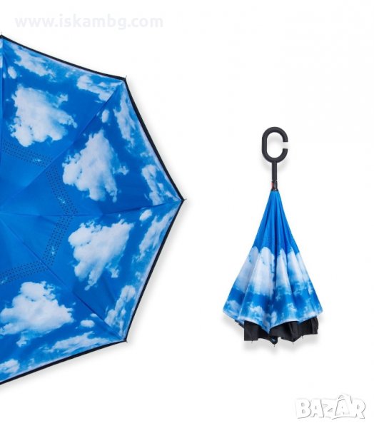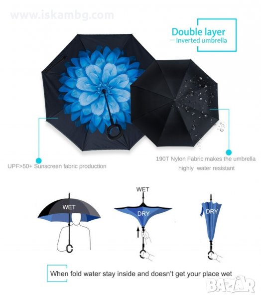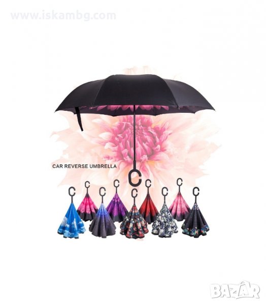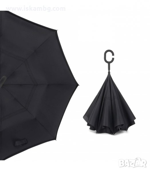 Чадър с обратно затваряне по-добрият чадър! Двупластов чадър, затварящ се на обратно с повърхност от полиестер, метални спици и дръжка от каучук. Обратното затваряне е много по-логично, тъй като така не се мокрите в дъждовните дни, особено като излизате например от колата, докато го отваряте или пък не мокрите своя дом като се приберете, тъй като благодарение на обратното затваряне (противоположно на обикновените чадъри) – водата остава в него.