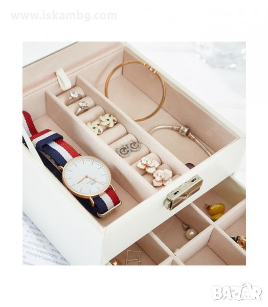 Кутията разполага с изтеглящо се чекмедже, а също и с основно отделение от три части като средната е специално за пръстени и обеци. Освен за бижута, кутията е подходяща и за козметика бяла или декоративна. Така получавате специално място за любимите си продукти, тези които използвате ежедневно или пък за добро организиране по време на пътуване.