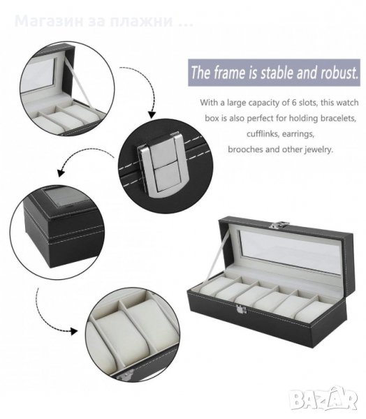 Ако и вие сте сред любителите на часовниците и имате завидна колекция от тях, то може би нашето предложение ще ви допадне стилна кутия с прозрачен капак, която е подходяща за съхранение на 6 аксесоара едновременно. Дизайнът е красив и практичен, а всеки часовник има свое собствено велурено легло. За да бъде защитен от надраскване, деформиране и събиране на прах.