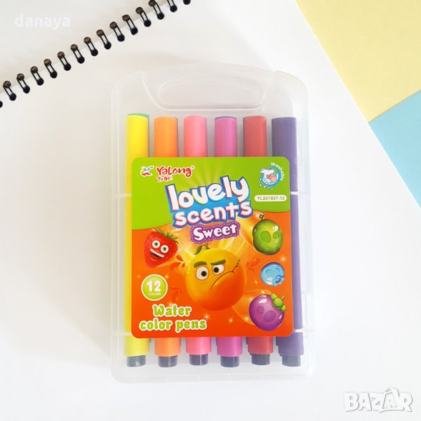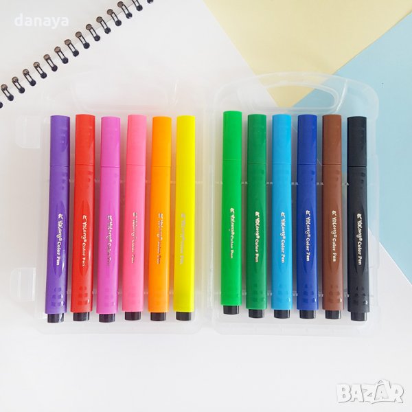 Комплект от 12 броя флумастери за рисуване и оцветяване, поместени в пластмасова кутия, тип куфарче. Гладко и лесно писане. Флумастерите не са токсични, измиват се лесно. Удобна триъгълна форма на тялото, което осигурява стабилен захват.