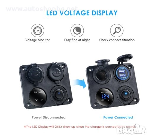 Един отвор за гнездо за запалка за кола (изход: DC 12V), един отвор LED волтметър (обхват на дисплея: 9-24V), и един отвор за превключвател за включване и изключване.