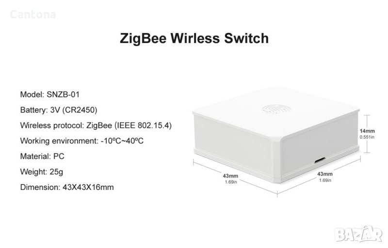 Спецификация: Вход: 5V 1A; Безжични връзки: IEEE 802.11 b/g/n 2.4GHZ, Zigbee 3.0; Материал: PC V0; Размери: 62X62X20mm Поддържащи подустройства: BASICZBR3 Smart Switch, S31 Lite zb Smart Plug, SNZB-01 Wireless Switch, SNZB-02 Temp. & Хъм. Сензор, сензор за движение SNZB-03, безжичен сензор за врата/прозорец SNZB-04