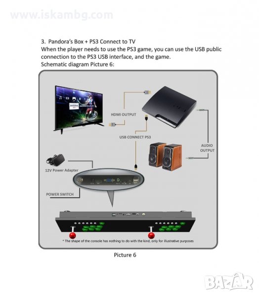 Ултра тънък дизайн на металната кутия. Може да свърже директно към телевизор или монитор чрез HDMI или VGA. Играта е с HD резолюция 720P. Аркадната станция може да бъде свързвана и към Play Station 3 или друго устройство посредством USB кабел (включен в комплекта).