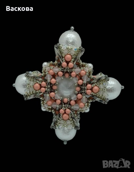 Използвани кристали и перли Сваровски, перли в цвят червен корал, висококачествена японска мънистар 14 мм японски памучни перли. Обратната страна е със закопчалка в сребърен цвят. Диаметър 8 см.