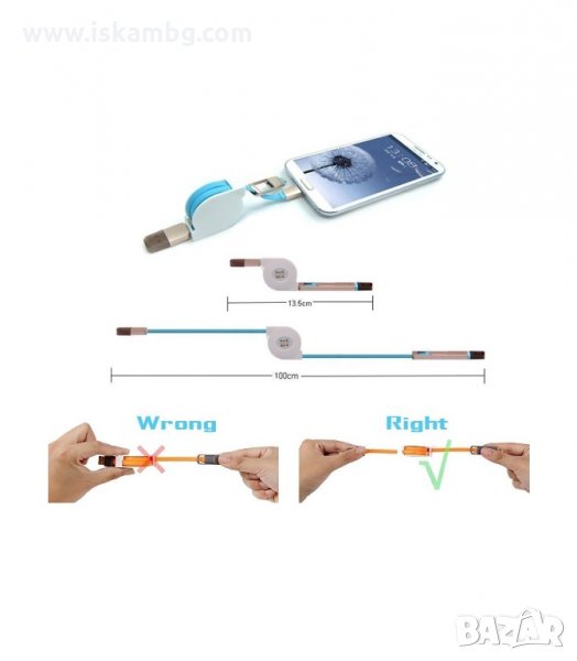 Прибиращ се USB кабел за Android и Iphone - за зареждане и трансфер на данни