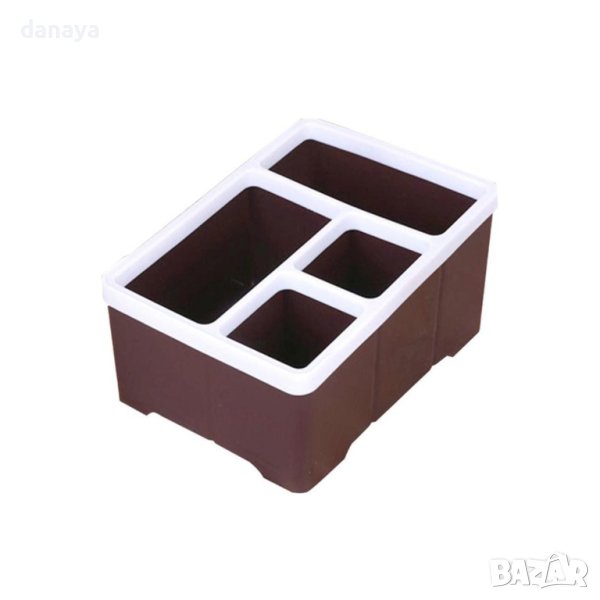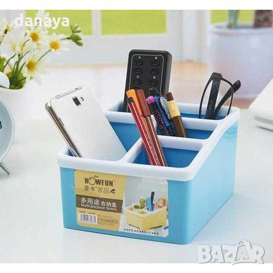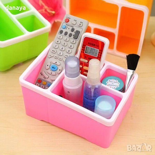 Практичен органайзер за бюро с 4 секции. Широко приложение – може да се използва като моливник, като органайзер за бюро, органайзер в банята, може да го използваш и като органайзер за гримове. Различен размер на всяко едно отделение. Предлага се в различни цветове.
