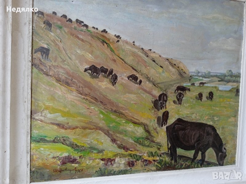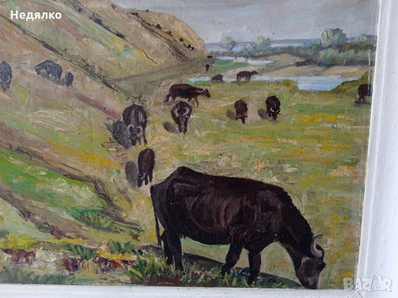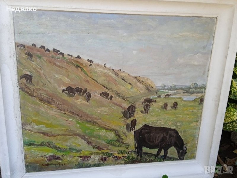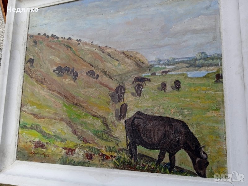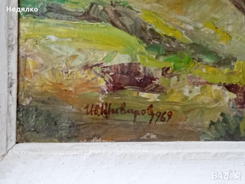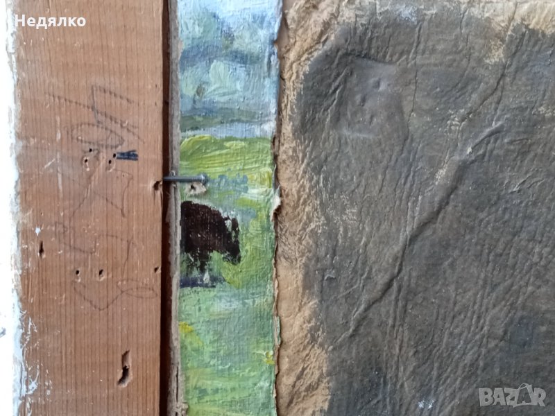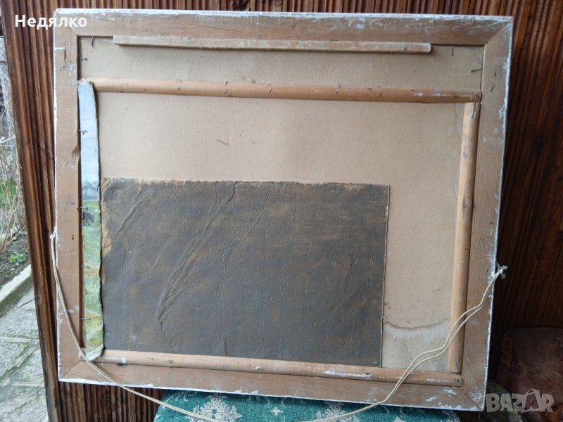 79х69 с рамка, 66х56 само картина,масло на картон,подпис долу в ляво,картината е направена от автора от 2 части ,над единия картон е приковал лента от около 10 см друг,надпис с молив на гърба долу в дясно,нечетливо дебърци или нещо от рода и четливо първомайско.