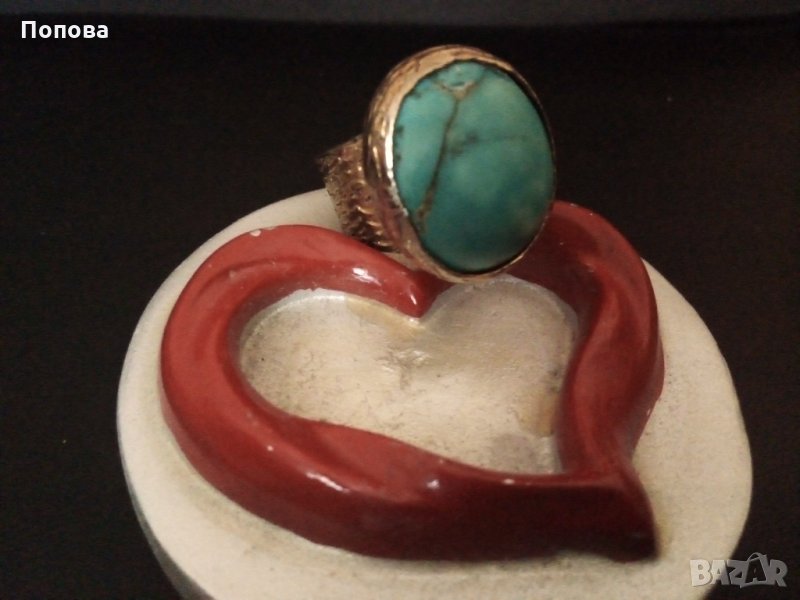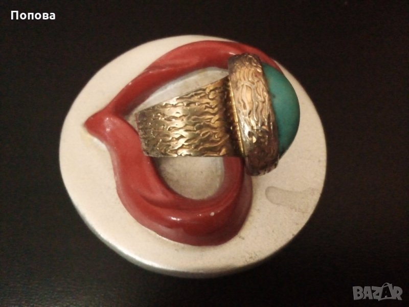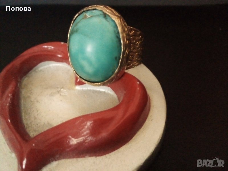 Уникално турско фирмено масивно бижу с голям естествен тюркоаз.Сребро 925 с позлата отгоре,изглежда като златен.Дизайнерска ръчна изработка,печати за проба и произход.Лицето на пръстена е с размер 21мм.на 17 мм. на 15 мм, халка 17,6 мм..Бижу,което не остава незабелязано.