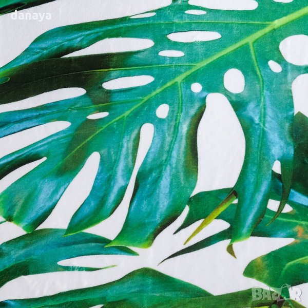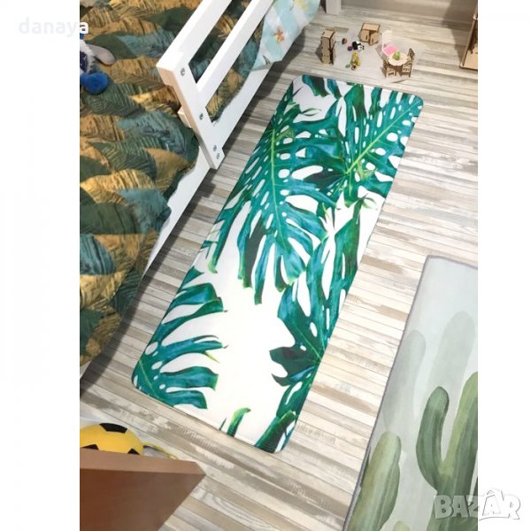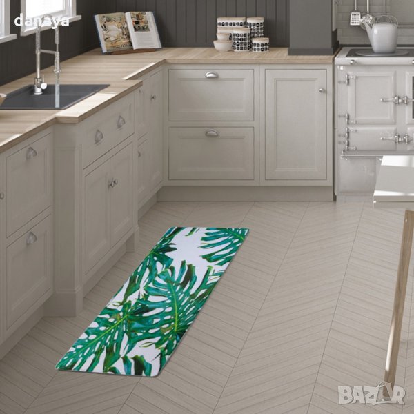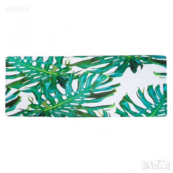 Текстилна постелка, тип пътека за кухня, баня или друга стая у дома. Малко килимче с приятна на допир външна част. Повърхността е гладка. Пътеката има противоплъзгаща основа, лесна е за почистване и подръжка. Ще стои чудесно пред дивана в хола, в малка кухня, в баня или в спалня. Модерен дизайн с тропически зелени листа с красиво съчетани цветове на бял фон, които ще паснат на повечето интериори в дома.