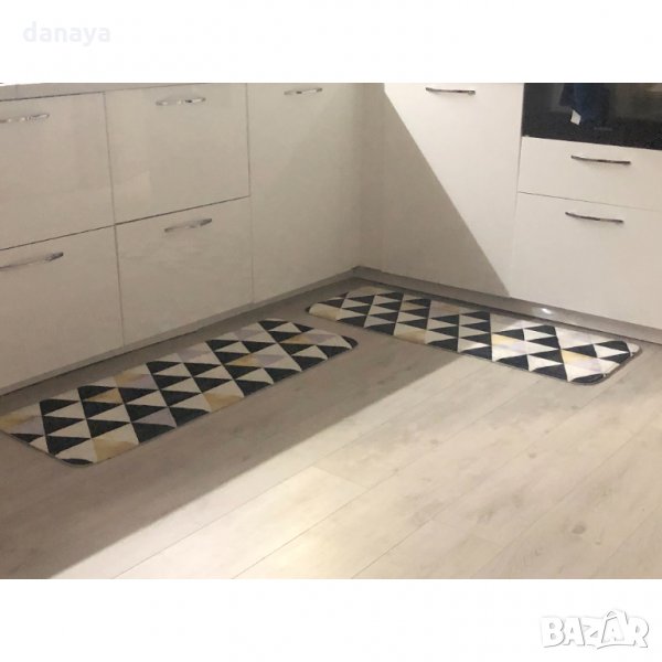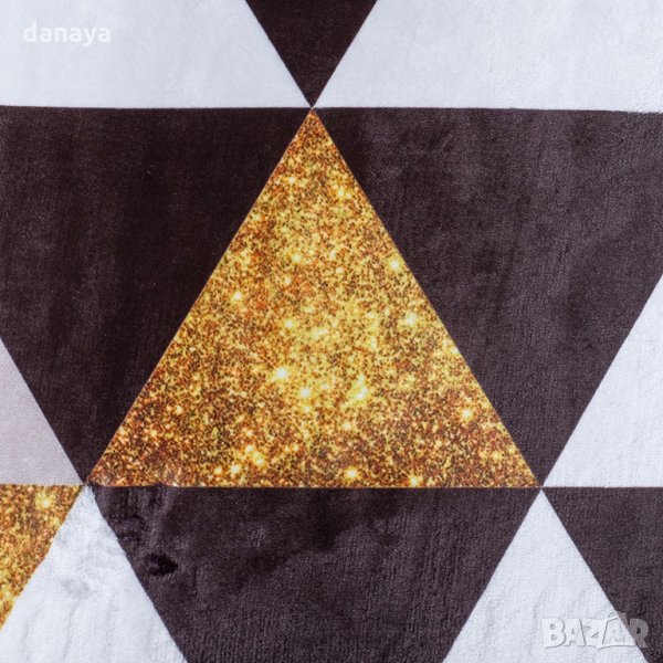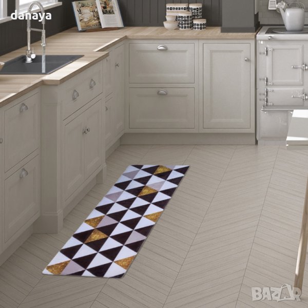 Текстилна постелка, тип пътека за кухня, баня или друга стая у дома. Малко килимче с приятна на допир външна част. Повърхността е гладка. Пътеката има противоплъзгаща основа, лесна е за почистване и подръжка. Ще стои чудесно пред дивана в хола, в малка кухня, в баня или в спалня. Модерен дизайн на триъгълници с красиво съчетани цветове, които ще паснат на повечето интериори в дома. Ярък и висококачествен печат.