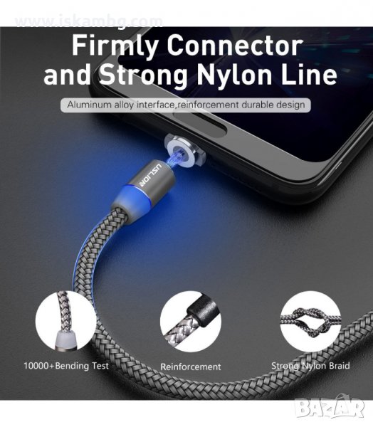 Високо качество и гаранция за дълъг живот. Uslion е един от водещите онлайн магазини за мобилни аксесоари в Китай, който е създаден през 2014 г. и обслужва милиони хора не само в региона на Китай, но и по целия свят със своите висококачествени и ефективни продукти. Базирана в Шенжен, компанията предоставя на потребителите си богата гама от дълготрайни и модерни аксесоари за телефони, като капаци за телефони, държачи за телефон, кабели за данни и за зареждане и много други. Кабелът пристига в 4 различни цвята, от които можете да избирате при поръчка, а освен това съществува в две вариации на дължината - 1 или 2 метра. Изработен е от висококачествени материали - жичната част е направена от мед и алуминиева сплав и е покрита със здрава и издръжлива найлонова плетена нишка от TPE пластмаса, а освен това кабелът разполага и с LED диод, който индикира щом има включено устройство към него. Освен гаранция за дълъг живот, този кабел ви предоставя и свобода на движението със своята 360-градусова ротация благодарение на силните магнити. Разполага и с функция за бързо зареждане, която дава възможност на устройството ви да достигне до пълен заряд за кратък период от време и така ще забравите за досадното зареждане през цялата нощ. Да се ползва с адаптер за зареждане до 1А, защото при по-високи стойности на тока, кабелът ще се нагрява. Несъмнено този кабел е една разумна инвестиция, за която вашето смарт устройство ще ви благодари.