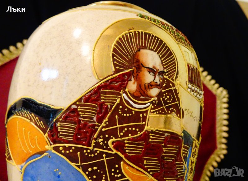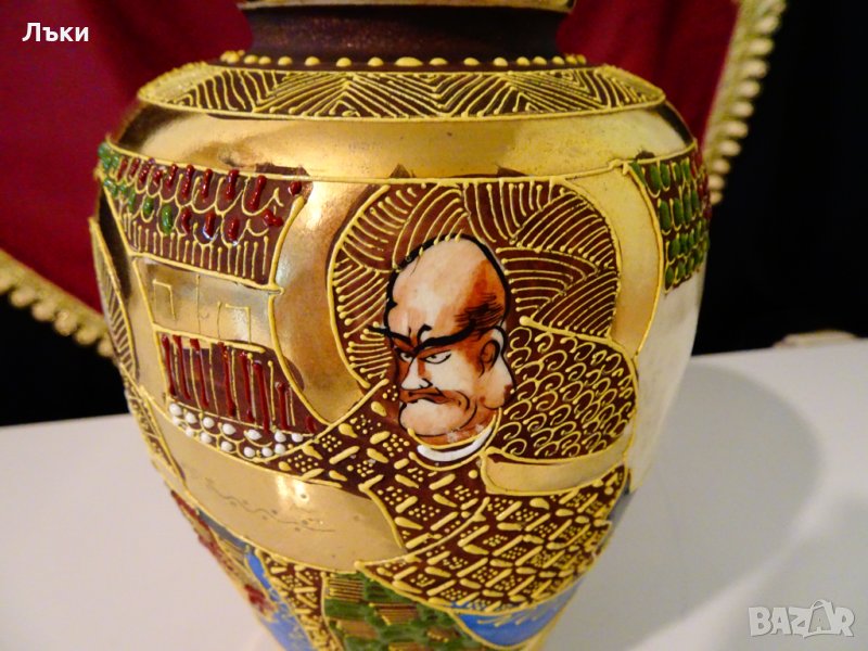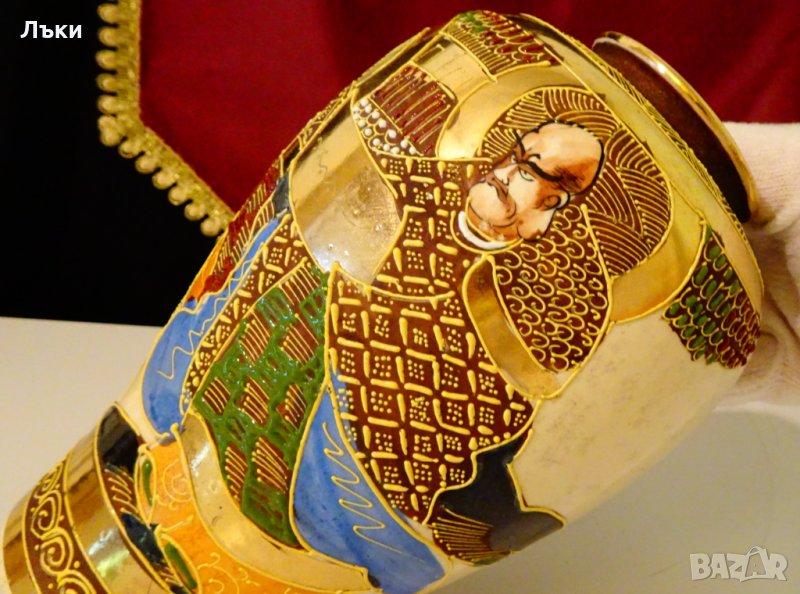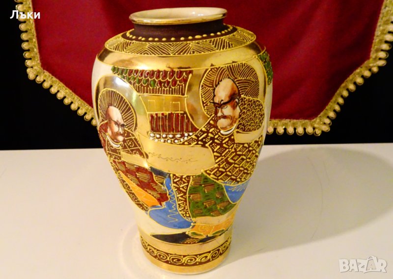 става най-големият производител на изделия Сацума от края на 19 век до 1927 г.,когато фабриката затваря.Вазата датира от периода Meiji – от 1868 до 1913 година.Ръчно рисувана с героите Зан и Яма,цветни релефни емайли Moriage и 24 карата злато.Вазата е маркирана. Височина 19.5 см.,диаметър 14 см.Перфектна.