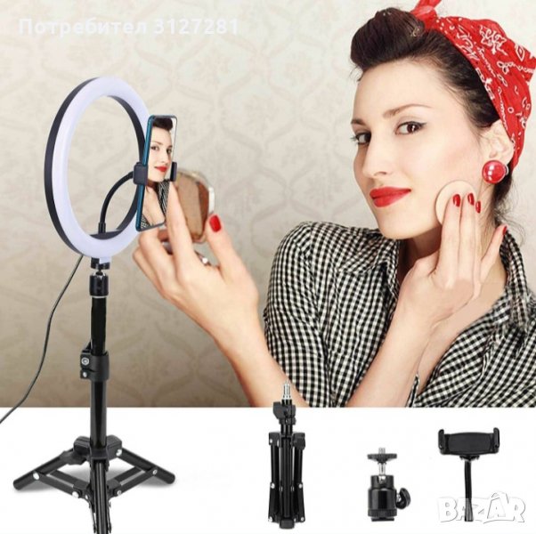 В комплекта: ринг лампа, статив – трипод, държач за телефон.