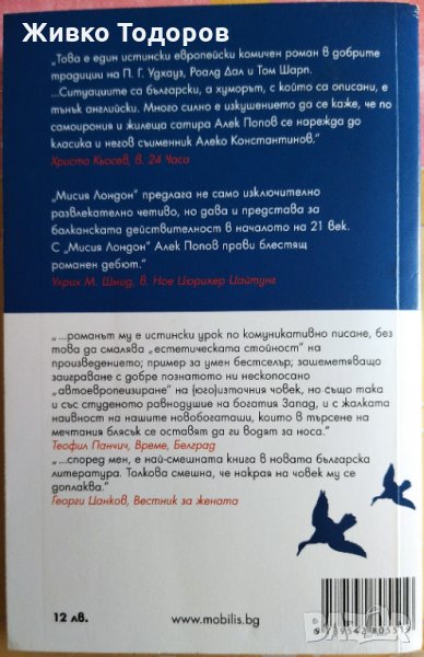 "Мисия Лондон" предлага не само изключително развлекателно четиво, но дава и представа за балканската действителност в началото на 21 век. С "Мисия Лондон" Алек Попов прави блестящ романен дебют."