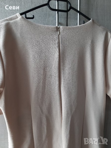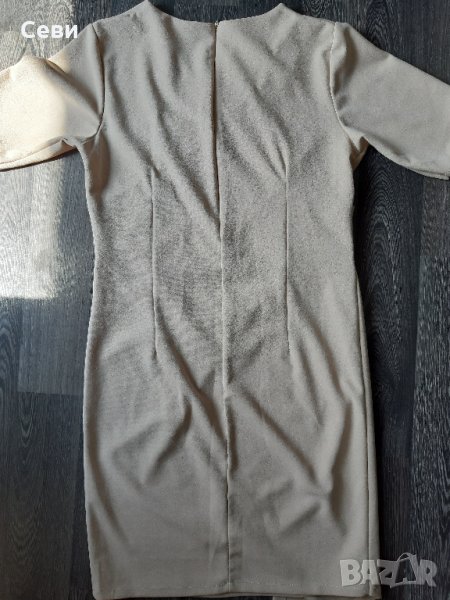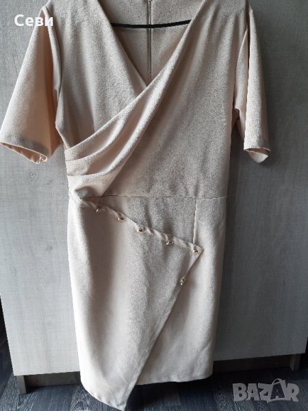 Красива рокля с асиметрична предна част и златисти копчета,деколте тип "прегърни ме ",скрит цип на гърба. Материя полиестер,цвят бежова.Размер С,М.Обличана веднъж, като нова.