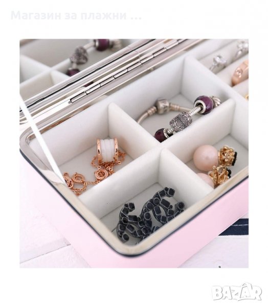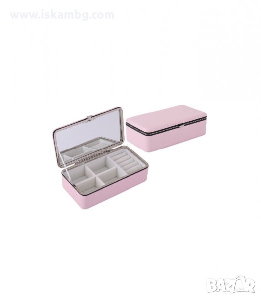 Кутия за бижута в правоъгълна форма в бял или розов цвят. Има много и различни отделения за подредбата и съхранението на бижута. На горният капак има малко огледало за по-голямо удобство. Отвън кутията е облицована в еко , а отвътре е с менк и нежен велур.