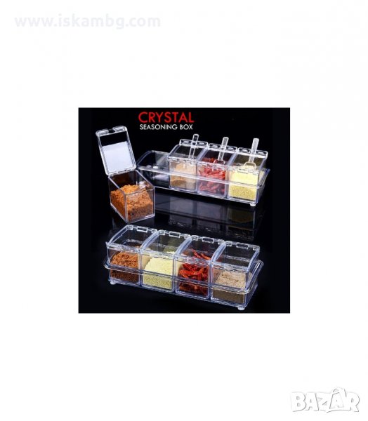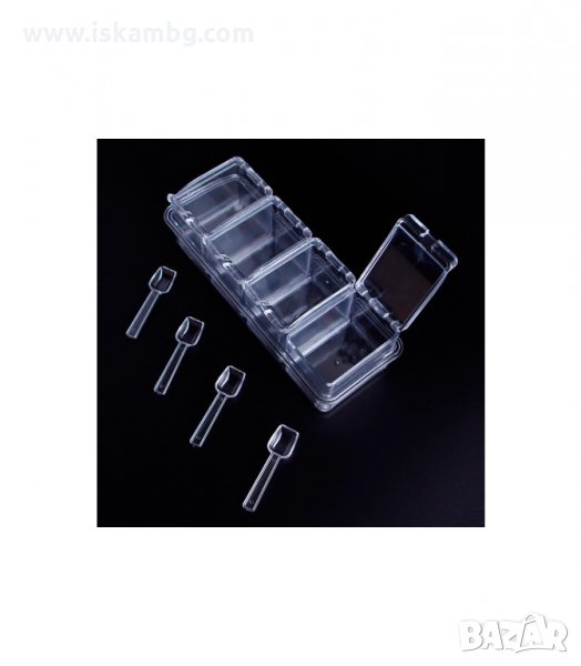 Кутията съдържа четири пластмасови контейнери, поставени в табла с крачета против плъзгане. Отделените контейнери са направени с капаче, за да не изветряват продуктите. Всеки от тях е снабден с малка лъжичка за да взимаш точното количество от подправките! Подходящи за съхранение на класически подправки, подправки за шкембе, различни видове чай, сухи билки и много др.