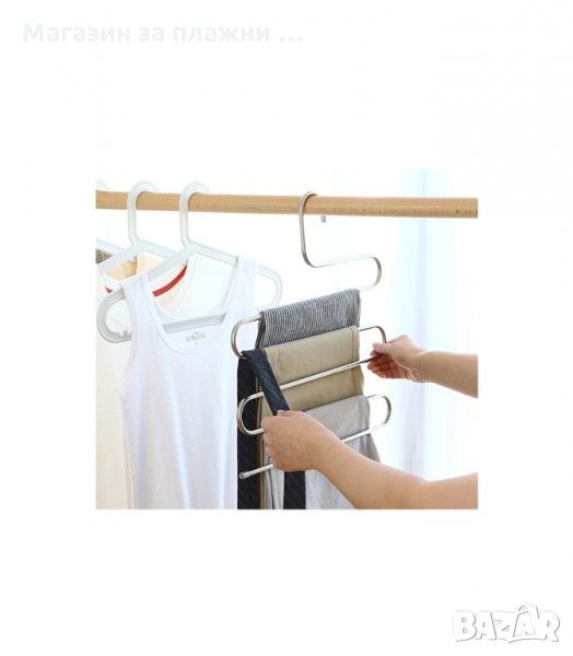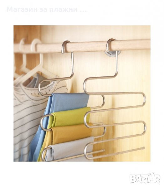 S-образна закачалка за поли, панталони, вратовръзки, кърпи и други. С тази закачалка органайзер ще спестите място в гардероба и дрехите, подредени на нея няма да се измачкат. Побира няколко чифта наведнъж.