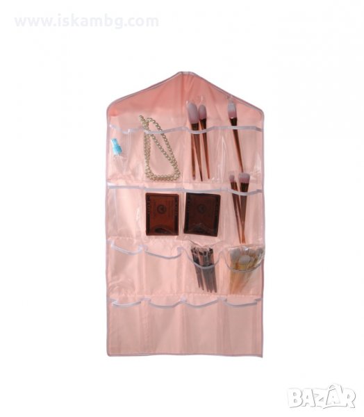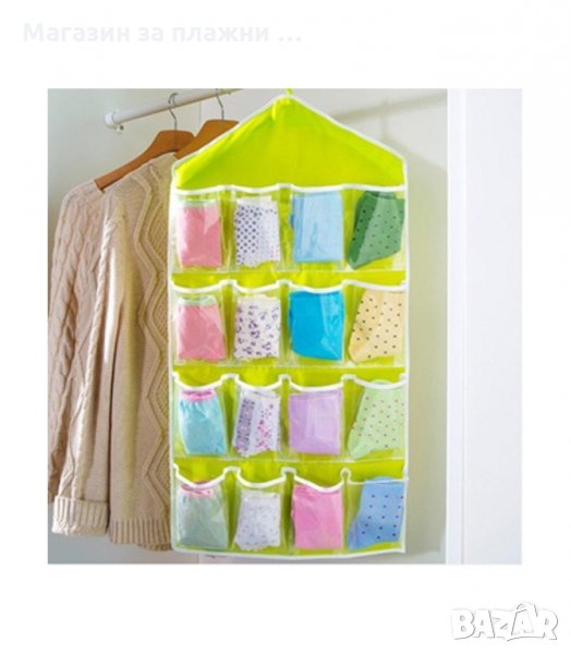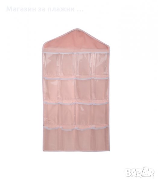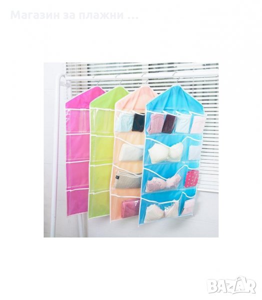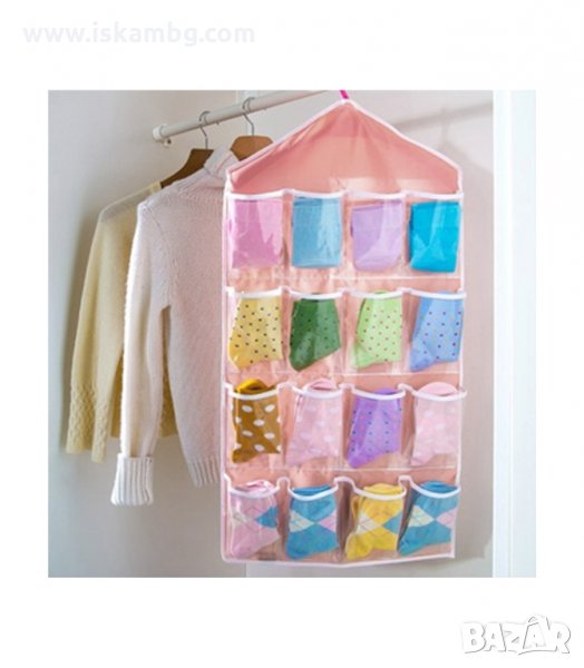 Практичен органайзер със 16 джобчета, подходящ за закачане в гардероб или на врата. Всеки джоб е прозрачен, така че всичко което търсите да бъде лесно открито. Освен за съхранение на чорапи и бельо, може да се използва и за съхранение на всякакви други дребни предмети като четки за грим, бижута, ножички, гребени и четка за коса и много други подобни.