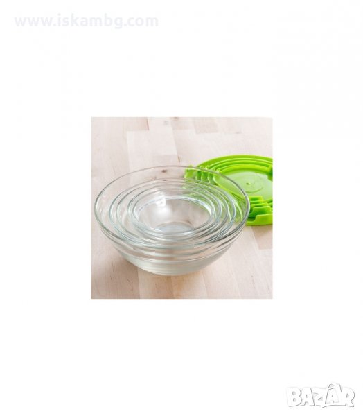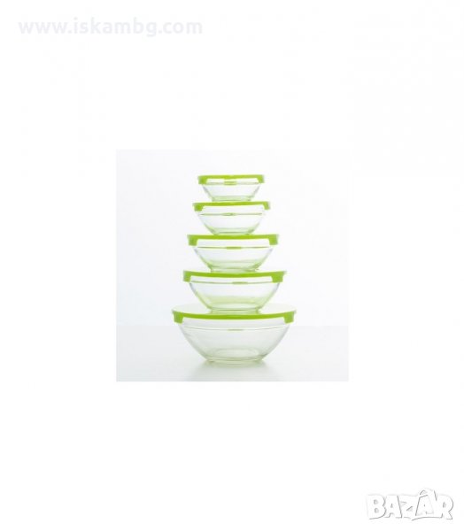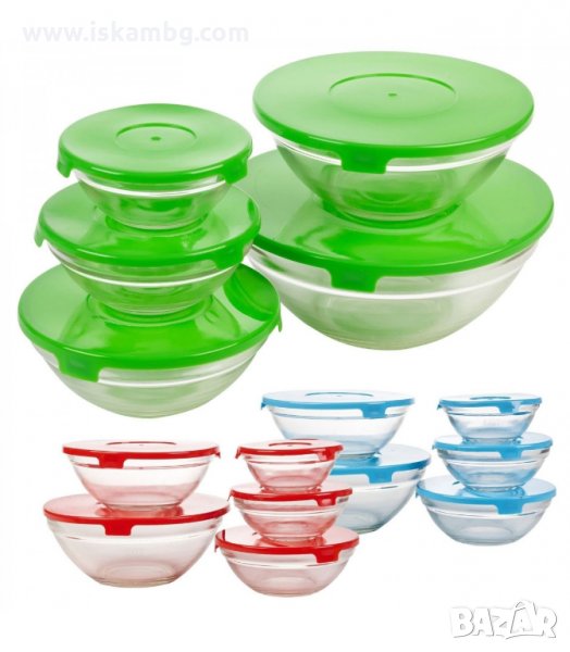 Комплекта съдържа 5 стъклени купи с пластмасови капаци. Капаците на купите се предлагат в различни цветове - червено, синьо, жълто и лилаво. Цветовия подбор е на случаен принцип. Ако желаете конкретен цвят моля напишете вашето желание в полето за допълнителен коментар при финализиране на поръчката.