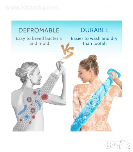 Мразите неудобството при опитите да достигнете труднодостъпните зони по време на душ? Представяме ви силиконовата гъба за тяло във форма на колан, която има няколко предимства, благодарение на които ще я превърнат в любимия ви аксесоар за баня. Благодарение на голямата си дължина от 62 см ви осигурява достигане до всички трудно достъпни места и тяхното третиране. Почиства тялото от мъртва кожа, като по този начин стимулират кръвообращението и облекчават мускулното напрежение. Има подходящо ниво на влажност за образуване на пяна.