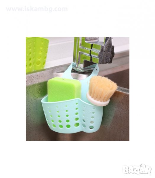 Регулируема кухненска поставка за чешма. Поставка за домакински гъби, телчета, попивателни кърпи, сапуни и други почистващи аксесоари. Със силиконова закопчалка и отвори за отцеждане. Може да се постави и на душа в банята