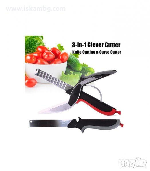 Ножица за зеленчуци и месо Clever Cuttler нож, която Ви представяме тук е много популярна в момента! И има защо! С нея повече няма да са Ви необходими дъски за рязане, ножове, почистването им след това, да се чудите къде точно да извършите тази процедура, разпилени и паднали продукти, а и най - лошото порязани пръсти! С ножица за зеленчуци и месо Clever Cuttler нож ще нарежете Вашата храна - бързо, лесно и безопасно, при това директно в съда, в който искате да е! Тайната й се крие в иновативния дизайн – ножица за рязане на месо и зеленчуци Clever Cuttler е с ергономична дръжка със силен натиск за лесно и бързо рязане, в долната си част - с пластмасова подложка за стабилност и опора, а в горната си - с прецизно наточено острие. Всичко това спомага за бързото и лесно рязане на зеленчуци, плодове, месо, хляб и др. Ножица за зеленчуци и месо Clever Cuttler е подходяща за съдомиялна машина.Тя е с заключващ се бутон за безопасност. Ножица за месо и зеленчуци Clever Cuttler нож е изработена от неръждаема стомана и висококачествени материали, което гарантира дългата й употреба.