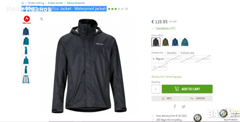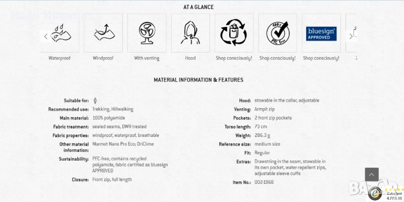 Съзнаващите теглото туристи и туристите ще намерят еко якето Marmot Precip като чудесен избор! Той прави без излишно тегло, но не прави компромис с функционалността. Благодарение на специалната мембрана Marmot NanoPro Eco, якето е надеждно водоустойчиво и ветроустойчиво, осигурявайки оптимална защита при лошо време. Концепцията, устойчива на атмосферни влияния, е закръглена със залепени шевове и водоотблъскващи ципове. За да се чувствате комфортно дори при най -неблагоприятните условия, качулката може да се регулира или прибира в яката. Ако започнете да се потите, циповете под мишниците осигуряват необходимата вентилация. За да се създаде приятен климат вътре в якето, маншетите и подгъва се регулират. Това означава, че тялото не се охлажда. Якето осигурява два практични джоба. Туристите ще се радват, че можете да съхранявате водоустойчивото яке Precip Eco в неговата собствена чанта. По този начин се побира в най -малката раница!