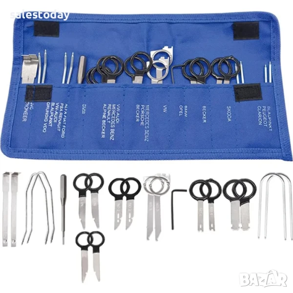 Пълен комплект инструменти за безопасно демонтиране на радио или навигационни устройства. Състои се от 20 части, включително различни приставки и ключове, подходящи за различни модели автомобили. Удобен и лесен за употреба, осигурява безопасно извършване на процедурата без повреждане на частите.