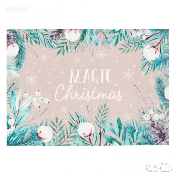 Пвц подложка за хранене с много нежен принт и надпис Magic Christmas. Подложката предпазва масата от изцапване по време на хранене, от петна от разливане на хранителни продукти, от изгаряне и надраскване. Освен това подложката е прекрасен декор за коледната трапеза. Ще стои чудесно във всеки модерен дом. Лесна за почистване и подръжка, поради състава си. Изработена е от PVC материал.