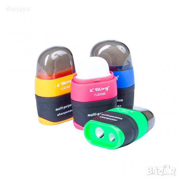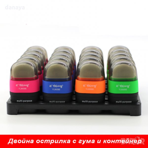 Двойна острилка за острене на моливи, с гума за триене на моливи и голям контейнер за събиране на на оптадъците от остренето. Компактен размер и форма. С острилката се остри супер лесно и гладко. Предлага се в 4 цвята – зелен, син, оранжев и розов.