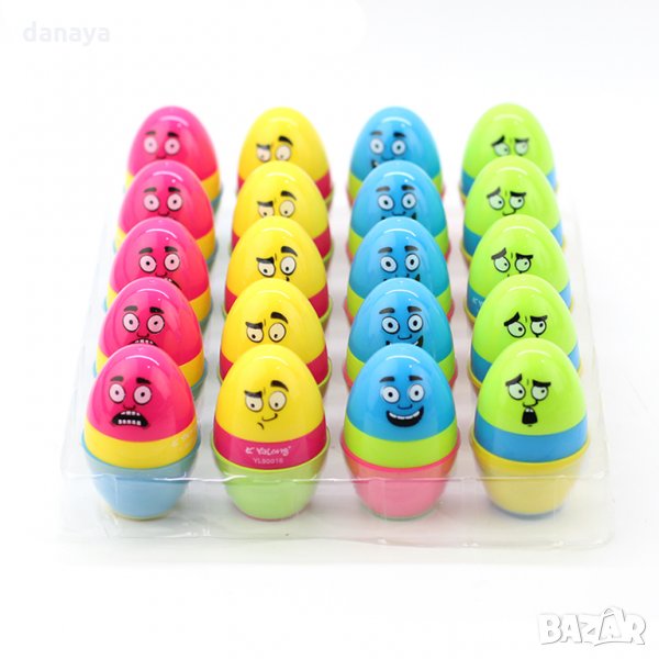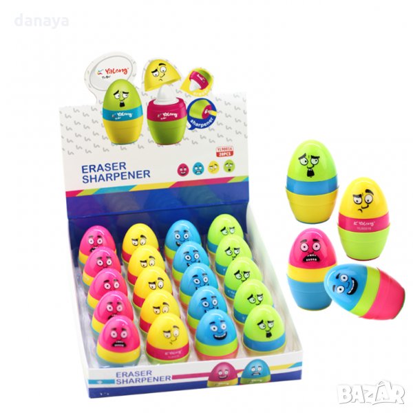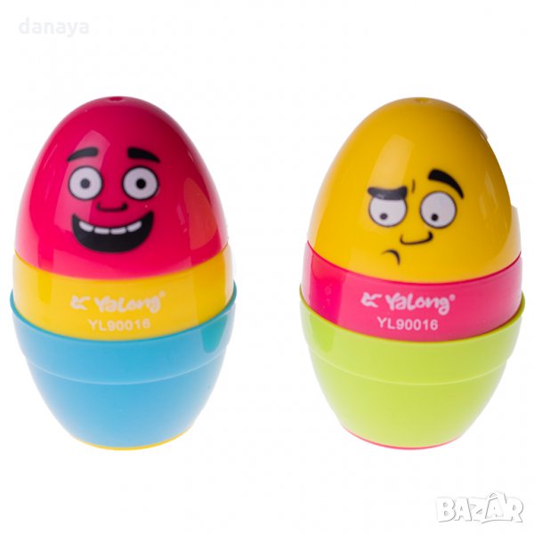 Ученическа острилка за острене на моливи, с гума за триене на моливи и контейнер за събиране на на оптадъците от остренето. Компактен размер и форма на забавно яйце. С острилката се остри супер лесно и гладко.