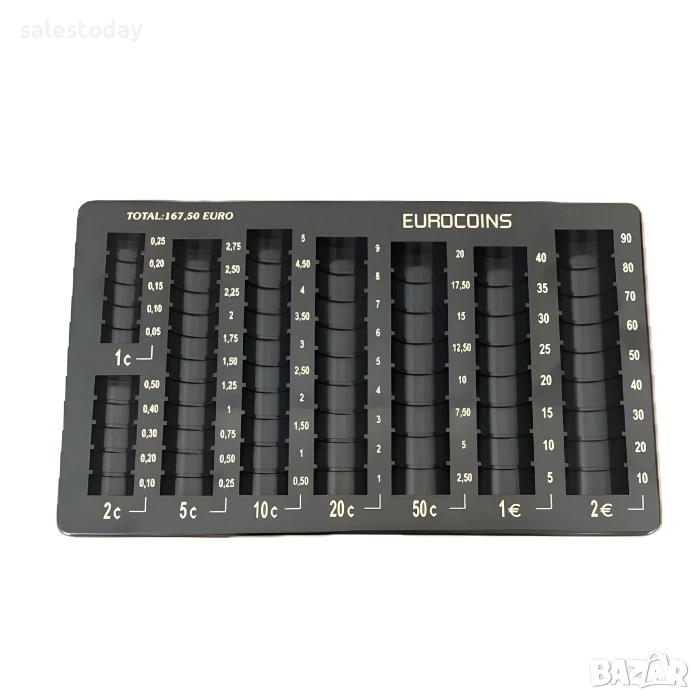 Професионален монетник за евро – практична монетна касета за сортиране и подреждане на евро монети по номинал. Подходящ е за работа на каса и улеснява бързото връщане на ресто, като поддържа монетите организирани и винаги под ръка.