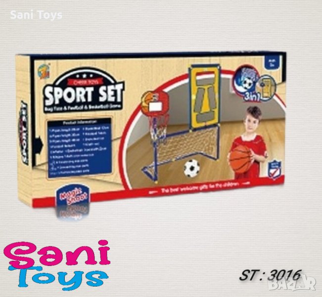 Превърнете дома или градината в игрална площадка с комплекта 3 в 1. С този комплект може да изберете, на коя от три игри да играете - баскетбол, футбол или фризби, за да бъде играта пълна са включени и футболна и баскетболна топка, ръчна помпа и фризби. Която и от игрите да изберете ще мотивирате децата да играят и да се движат активно.