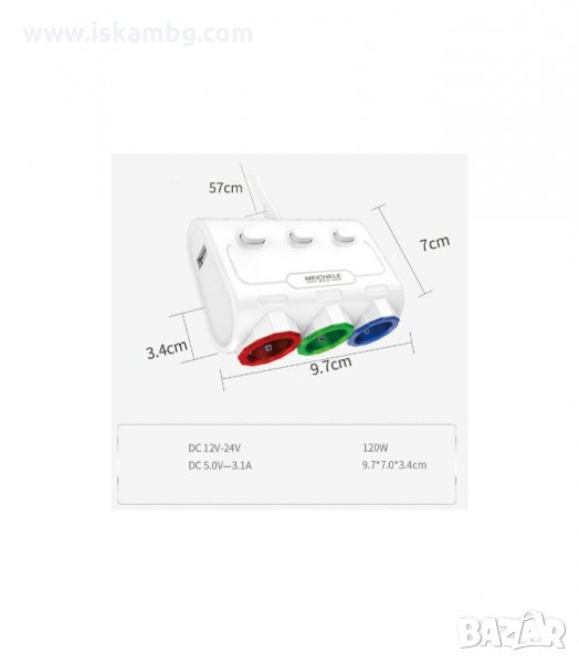 Опростен и компактен дизайн, лесен за инсталиране и използване. Изработен от пластмаса, гумиран ABS материал, здрав и издръжлив във времето. Предлага три гнезда за запалка двете се използват само като разклонители, а едното гнездо може да се използва със самата запалка на автомобила. В двата края на този разклонител се намират два USB порта за зареждане на таблети, смартфони, MP3, MP4, GPS и т.н.