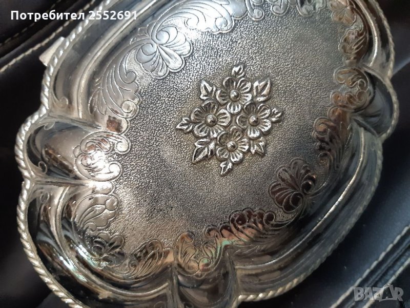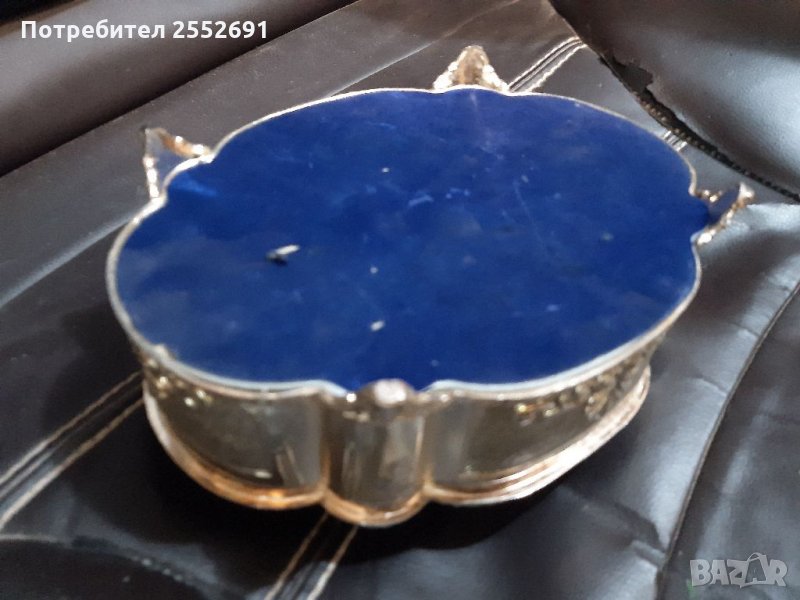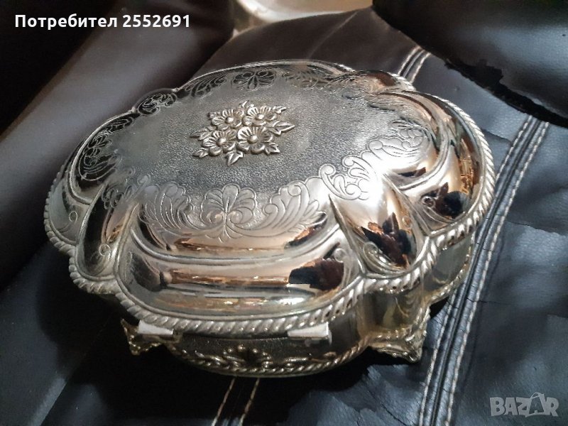 Метална, посребрена, инкрустирана кутия за бижута. Размери- 20/15/8см.