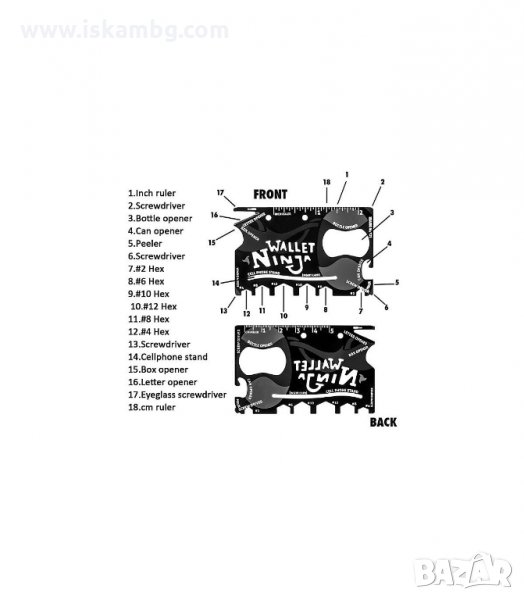 Представяме ви най-гениалното изобретение за всеки ценител на компактността - Wallet ninja 18 в 1 мултифункционален инструмент за портфейл. Този шедьовър е повече от специален. Той ще се превърне в най-добрия ви приятел, който ще бъде винаги с вас и ще ви помага във всяка една ситуация. При това, заема място, колко една банкова карта. Какво повече му трябва на човек? Побързайте да се сдобиете с него и не забравяйте да подарите и на приятели. Защото това е страхотен инструмент, подходящ за моментите, в които не сте вкъщи и нямате под ръка нужните джаджи, за да поправите нещо, например.