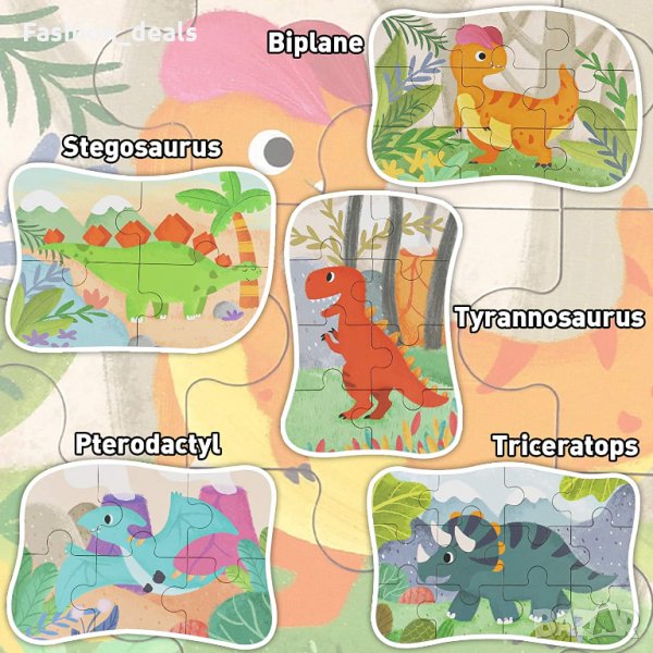 Първата е с животни, включващ 5 теми - жираф, лъв, слон, носорог, гепард. Втората е с динозаври, включващ 5 различни динозавъра с различни парчета пъзел, представлява различна степен на трудност.