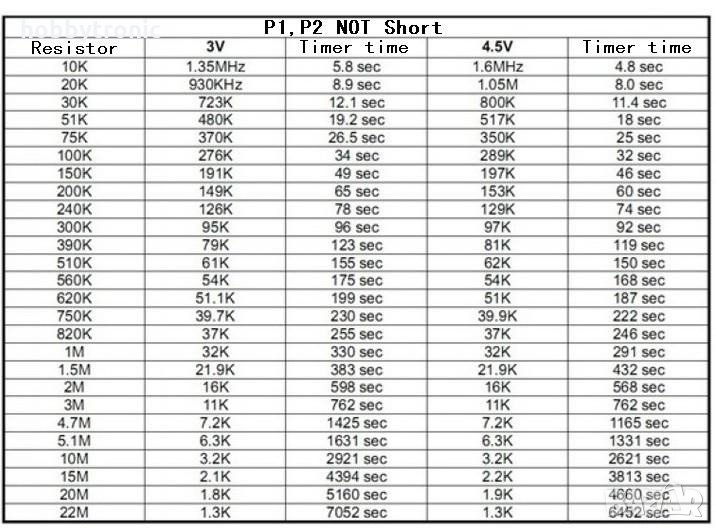 При окъсяване на P1 и P2, удължаваме времето, зададено от RT резистора от 512 пъти.