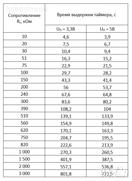 OUT - Изход. След стартиране напрежението на изхода е „0” (между 0 и 0,3V). След изтичане на зададеното време изходът преминава в „1” (VCC).