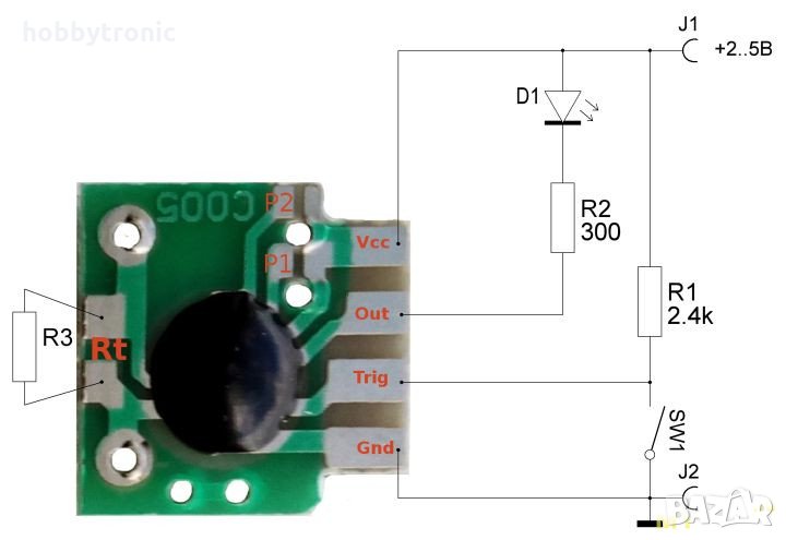 P1, P2 При късо съединение на P1, удължаваме 8 пъти времето, зададено от резистора RT.