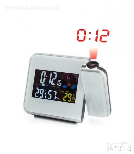 3 в 1 Настолен часовник - метео станция с прожектор за стена и таван + влагомер, термометър, аларма и цветен дисплей.