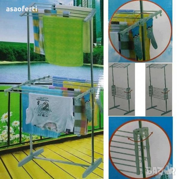 Сушилникът е сгъваем и подвижен, с два етажа за сушене на дрехи. Поради малкия си размер продуктът е много лесен за придвижване.