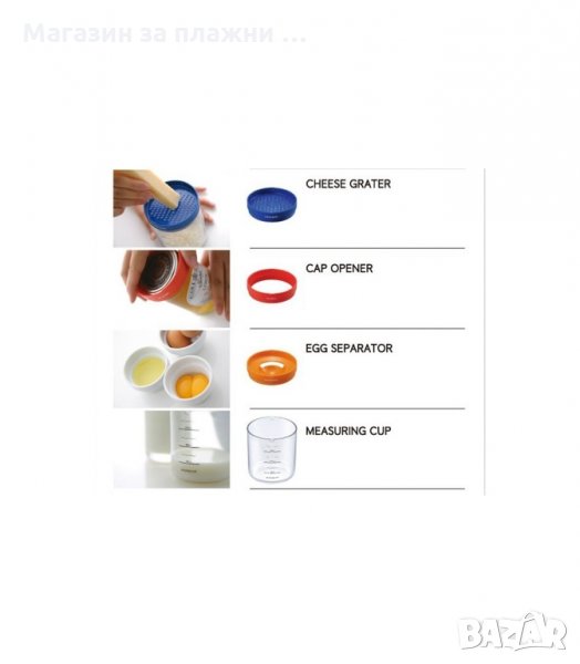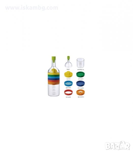 Практичен и цялостен комплект, който включва голямо разнообразие от кухненски прибори, като заема малко място, благодарение на подредената си структура в бутилка. Удобен и лесен начин за поддържане на ред в кухнята, за да имате под ръка всичко необходимо във всеки момент.