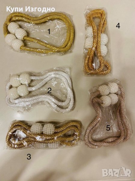 Стоят перфектно, както на светли, така и на тъмни платове. Универсалната комбинация от златисти на цвят нишки, оформящи здрава вързулка и PVC топчетата, приличащи на перли, са удобни за ползване във всяка стая (спалня или хол).