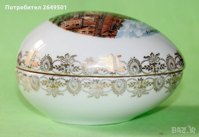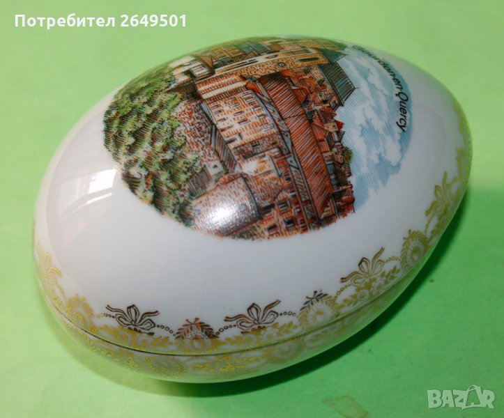 Френски Порцелан Яйце Кутия Limoges porcelain. От 1980те. Мотива на капака е от град Gourdon Отстрани еима кант с флорални мотови с позлата. Дълга е 12 см. Широка 8.5 см. Без забележки МИНТ! Не мога да я снимам добре има много отблясъци. На живо е по красива.